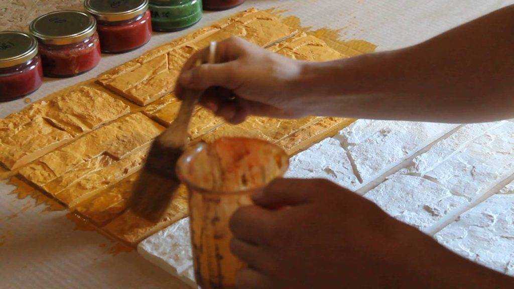 Красить гипс можно двумя способами. При первом краску наносят на уже отлитое и высохшее изделие. Для окрашивания «под кирпич» можно использовать акриловые краски и даже простую акварель. При этом способе легче подобрать нужный тон или сделать плитку разноцветной. Однако у него есть существенные недостатки: выцветание и высокая вероятность повреждения верхнего цветного слоя.