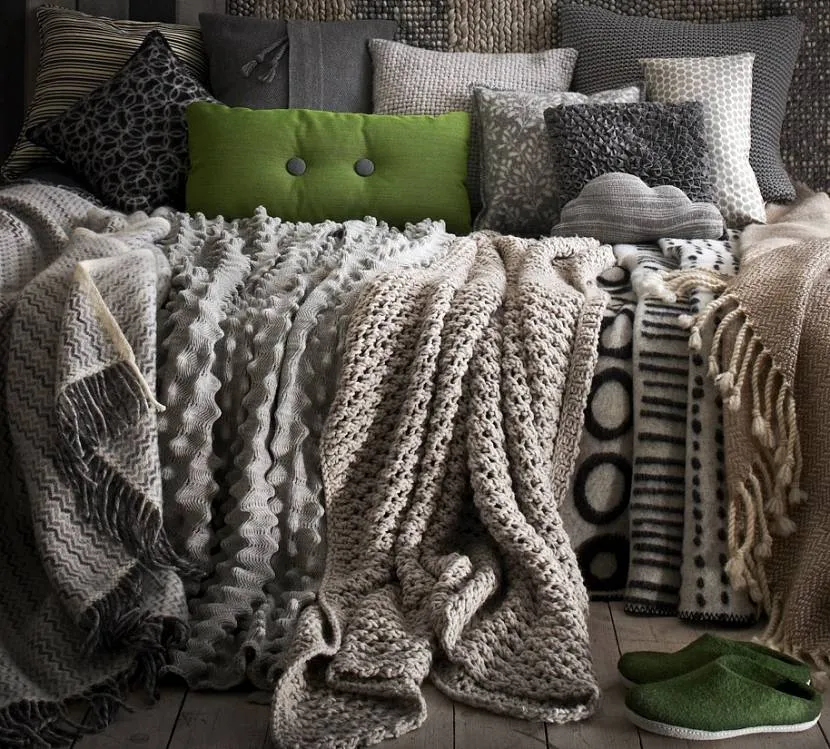 Не желательно чтобы плед имел оттенок, не повторяющийся в окружающем интерьерном пространстве или совпадал по цвету с мягкой мебелью, это лишит покрывало индивидуальности. Накидки в более нейтральных и неброских расцветках с мягкими текстурами, не создают ярких акцентов и формируют спокойный и умиротворенный дизайн.
