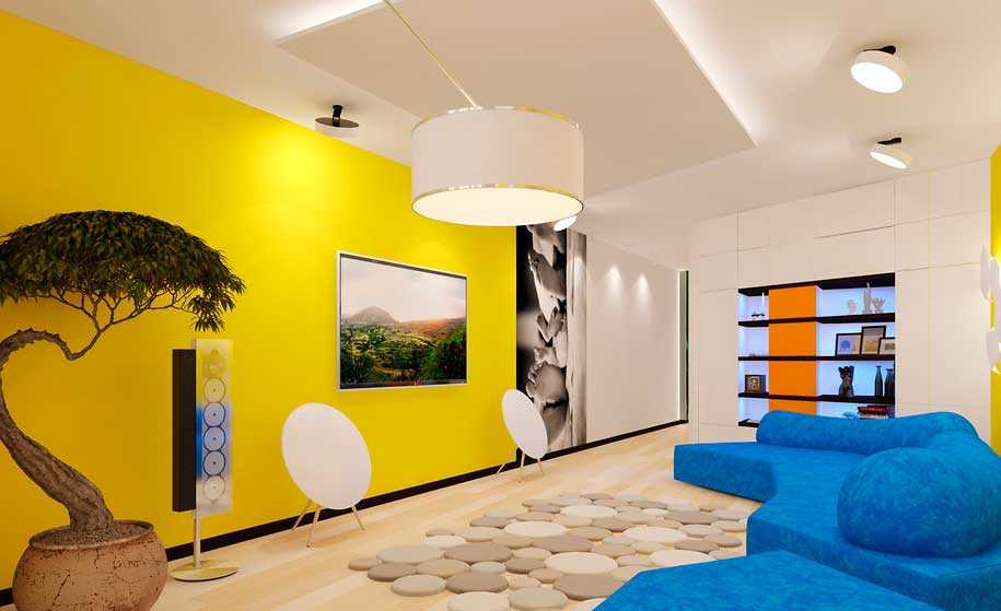 Комната лучше всего подходит для реализации всех особенностей дизайнерского направления. Для отделки полов подойдет светлый ламинат или паркет, для потолка – натяжные или подвесные конструкции. Стены в интерьере гостиной в стиле поп-арт можно покрасить, отделать объемными пластиковыми панелями или оклеить обоями с оптической иллюзией. Наиболее популярное цветовое решение для комнаты: основа из нейтральных тонов (черный, серый, белый, коричневый) и яркие пятна для предметов обстановки или акцентных стен.