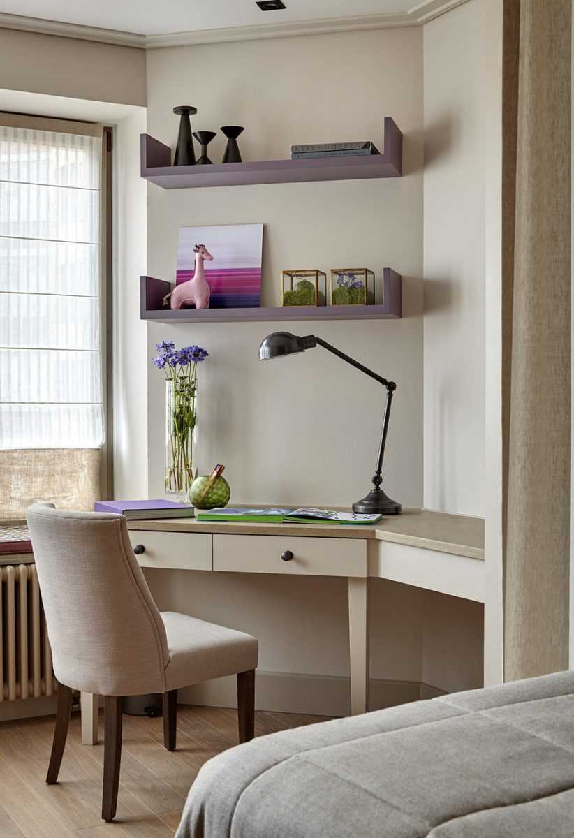 - В нише. Углубление в стене, представляет собой идеальное место для работы. Единственным минусом такого расположения в нише без окна, является дефицит естественного освещения, который с легкостью компенсируется дополнительными встроенными светильниками.