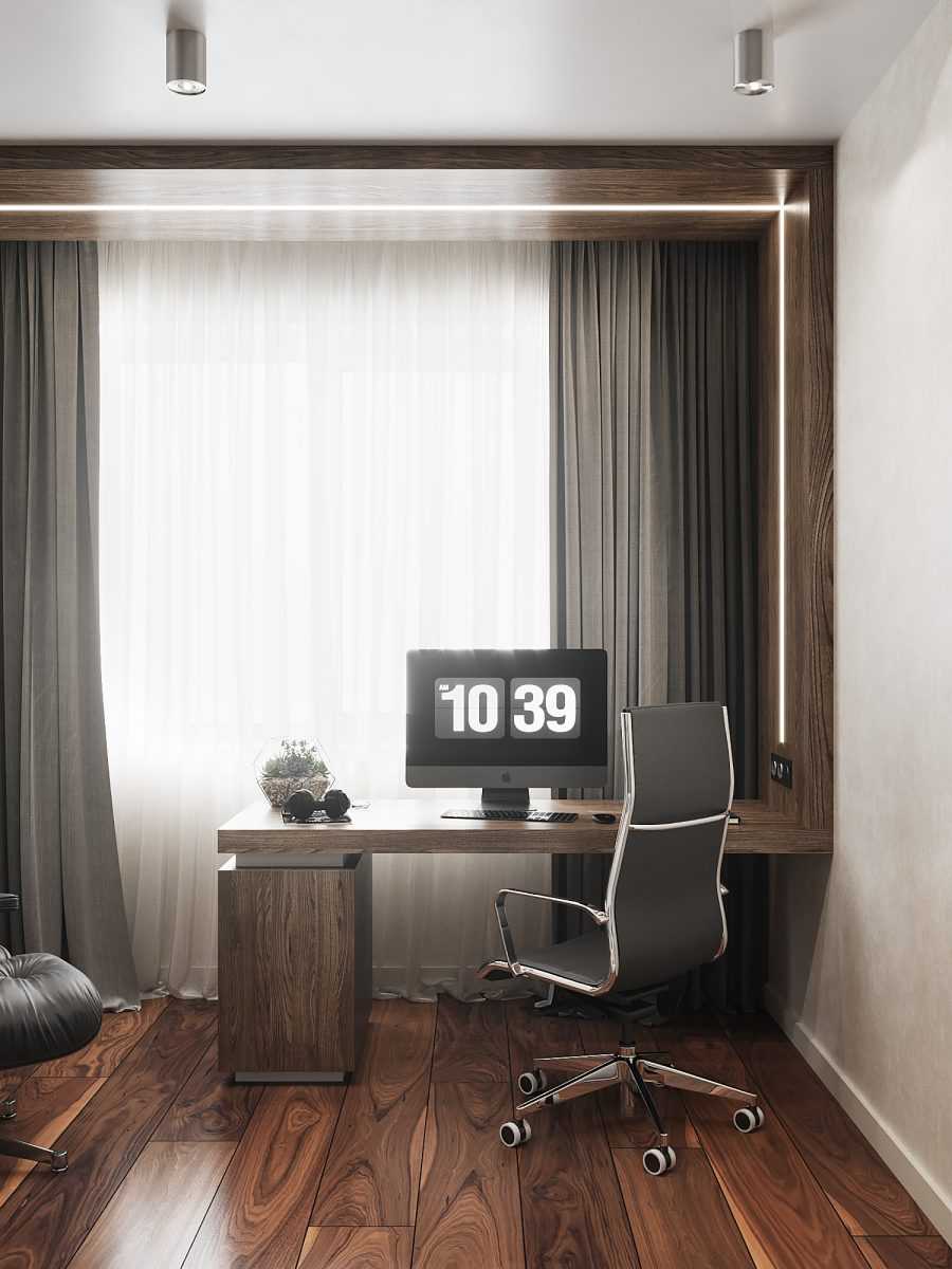 - Подбор штор. Легкая и струящаяся ткань дополнит минималистичный интерьер помещения. В роскошный кабинет рекомендуют подобрать плотные гардины из дорогого материала. Ткань с принтом будет выглядеть глупо в рабочей зоне, в то время как простые однотонные модели добавят шарма и цвета в помещение. Базовый вариант — рольставни или жалюзи в тон основной композиции кабинета.