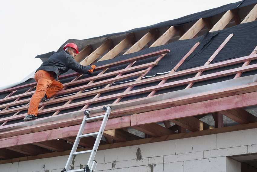 Размеры обрешетки и расстояние между ее отдельными элементами рассчитывается по специальным формулам. Для произведения правильных расчетов необходимо учитывать уклон кровли и используемый материал для ее отделки. Для обустройства обрешетки используется брус, имеющий сечение от 40 до 50 миллиметров.
