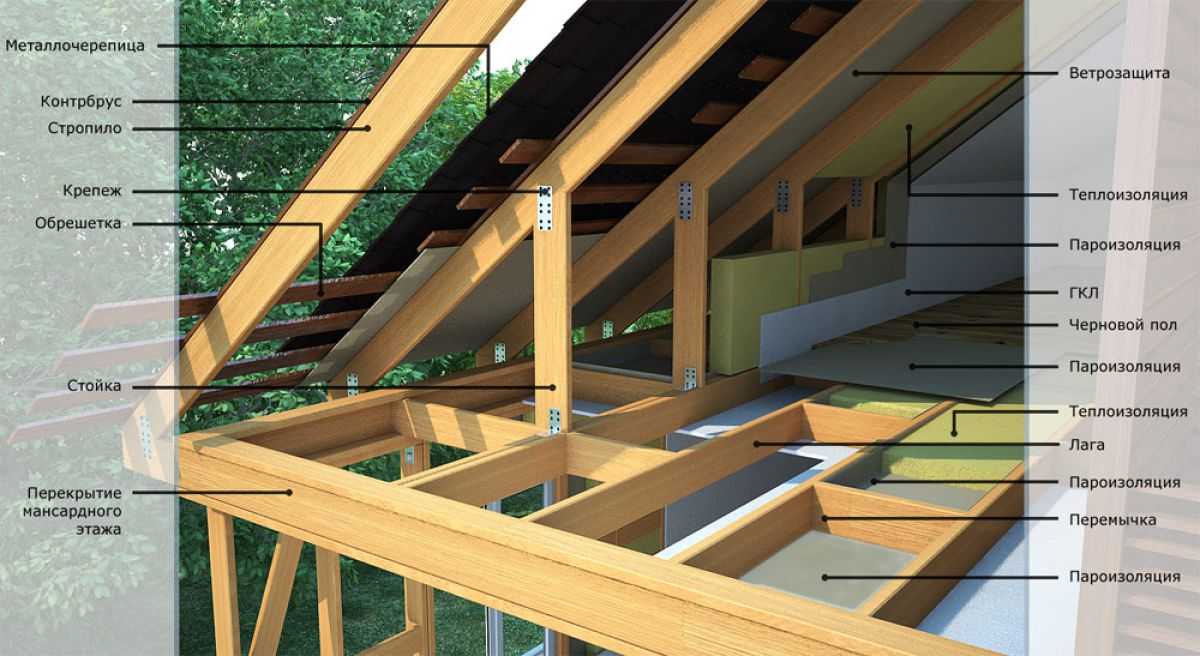 Устройство двухскатной крыши с мансардой и холодным чердаком над ней. Большой пролет кровли вынуждает использовать центральную стойку, на которую опираются наслонные стропила. Боковые стойки придают скатам дополнительную жесткость и служат каркасом для стен мансарды.