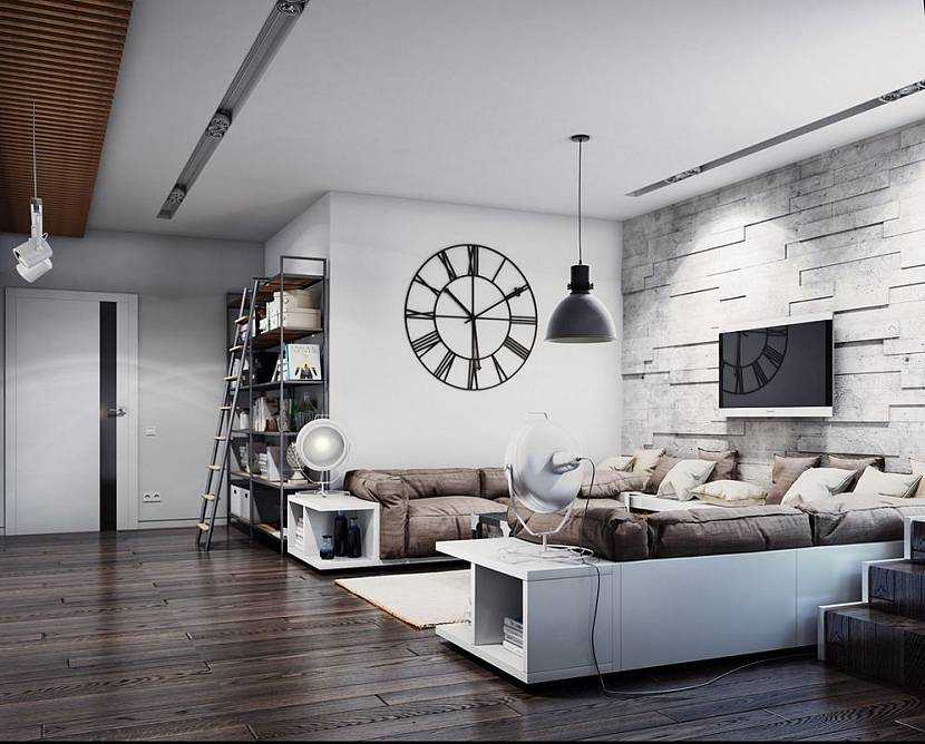 Немного небрежный стиль, в котором нет места лишней мебели. Для того, чтобы добавить помещению уюта, можно сделать темный пол из ламината, грубоватой паркетной доски и даже глянцевой плитки. Некоторые владельцы предпочитают оставить бетонное покрытие, при этом возникает ощущение незаконченной стяжки. Такой пол потребует дополнительного утепления.