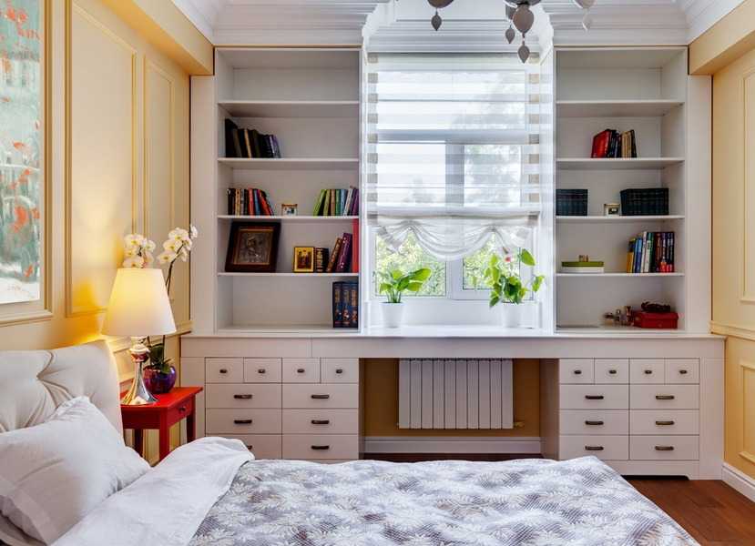 Обычно в качестве места для хранения используется лишь верхняя часть подоконника, но при этом многие не учитывают, что можно эффективно распорядиться и пространством под ним. Отличное решение – это соединить окна на короткой стене с помощью подоконника, протянутого вдоль нее. А под ним можно расположить различные шкафчики и выдвижные тумбы, а верхняя часть может превратиться в столешницу или уютное место для отдыха и чтения книг. Если под окном находится батарея, тогда установите на нее декоративный экран. При этом шкафчики пусть располагают по обе стороны от батареи.