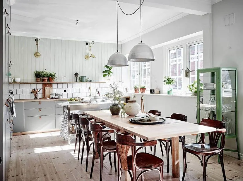 В качестве декора для кухни в шведском стиле подойдут настенные кашпо и стеклянные панно с фотопечатью, люстра в стиле дворцовых канделябров, декоративные скандинавские вещицы.