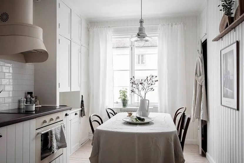 Выполненная в шведском стиле кухня содержит минимальный набор мебели: кухонный гарнитур, стол и стулья. Шведский интерьер отличается требовательностью к порядку, уместно будут смотреться белые окрашенные стены и жалюзи на окнах. В контрасте с ними прекрасно будут сочетаться цветущие растения в белых однотонных вазонах.
