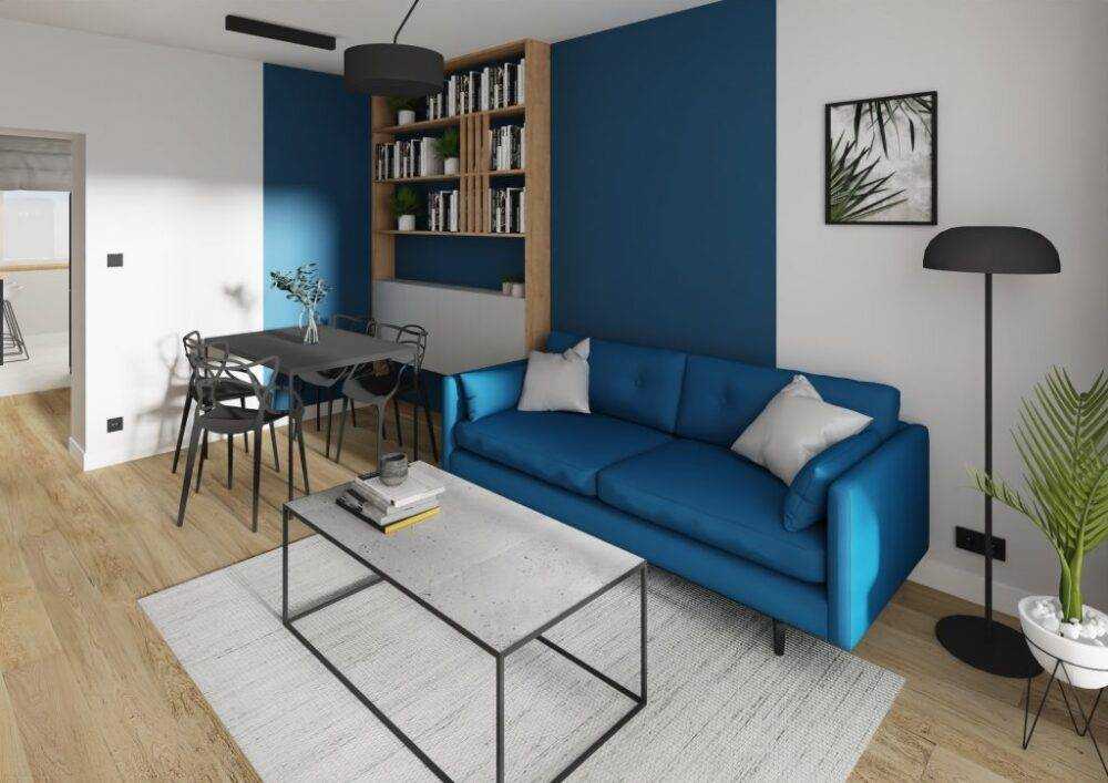 При этом, в отличие от нейтральных оттенков, таких как серый или черный, синий диван в гостиной оживляет интерьер и является интересным акцентом, привлекающим внимание. Более темный оттенок также облегчает уход за этой мягкой мебелью