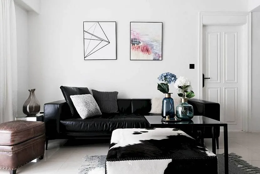 Если темная мебель в интерьере преобладает, то пятном будет белая кушетка или журнальный столик в центре комнаты. Предмет притягивает взгляд входящих, поэтому дизайн выстраивают вокруг декора. В помещении с черным шкафом стоит повесить картины (зеркала) в снежных багетах. Эффектно смотрятся крупные напольные вазы, которые по тону перекликаются со шторами. При дефиците свободного пространства акцент можно перенести на люстру.
