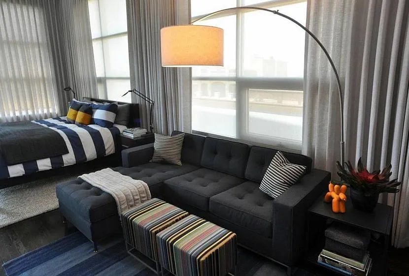 - Первым делом нужно разобраться с диваном. Если он слишком громоздкий – его ни в коем случае нельзя ставить в центр. Связано это с тем, что он будет поглощать свет. Также будет идеально, если вы поставите диван с ножками, которые выделят пространство между полом и днищем. Так будет создаваться ощущение легкости.