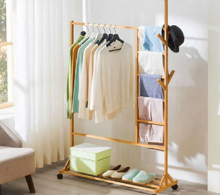 Также очень популярна обычная перекладина с плечиками на колесиках. Это очень практичный и удобный вариант и подойдет практически всем.