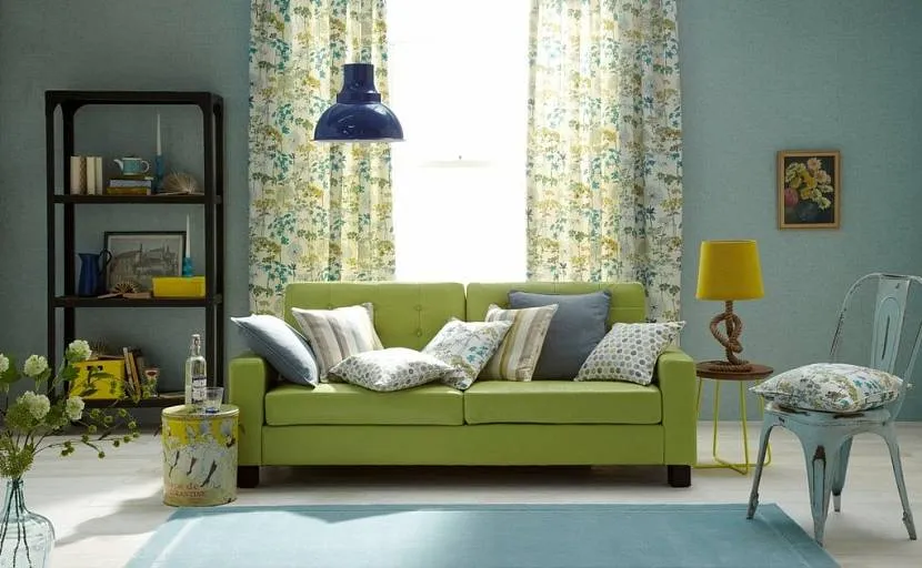 Если нужна игра контрастов, можно попробовать найти качественные шторы из плотной ткани, которые помогут создать в доме максимально уютную обстановку. Украшенные тяжелыми гардинами и интересными узорами, такие шторы понравятся многим ценителям винтажа. Отлично однотонные зеленые обои сочетаются с цветами из «морской» палитры. В таких цветах могут быть выполнены шторы и диван.