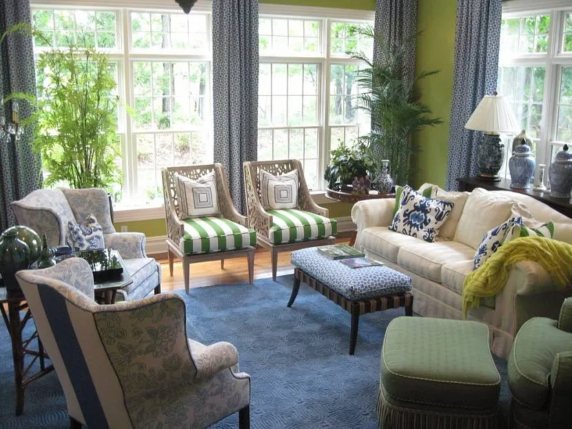 Сложнее подобрать гармоничное сочетание двух активных цветов. Зеленый плохо сочетается с красным, ярким золотым или броским фиолетовым тонами. Нужно аккуратно подбирать оттенки и приглушать их декоративными мелочами. Однако предпочтительней изначально следить, чтобы предметы обстановки сочетались между собой.