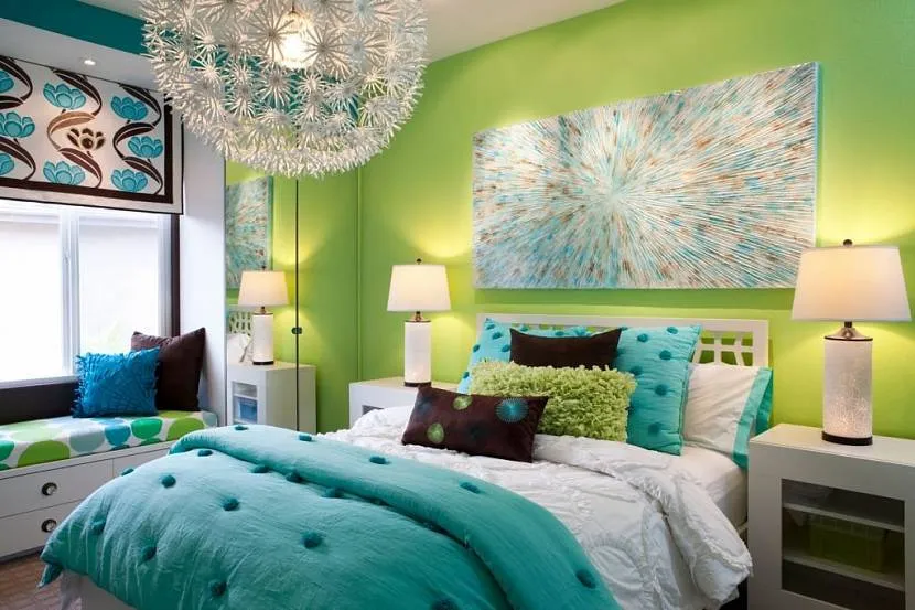 Спальня, оформленная в салатовых тонах, благоприятно воздействует на физическое и психическое здоровье человека. Известно, что бледный салатовый оттенок способствует снижению артериального давления. Кроме того, салатовый цвет помогает быстро снять нервное напряжение. При умелом грамотном сочетании салатового с другими оттенками, в спальне будет создан положительный настрой при любой погоде за окном. Можно выбрать настенные покрытия салатового цвета или повесить шторы данного оттенка. Можно купить текстиль или прикроватные коврики, выдержанные в салатовых тонах.